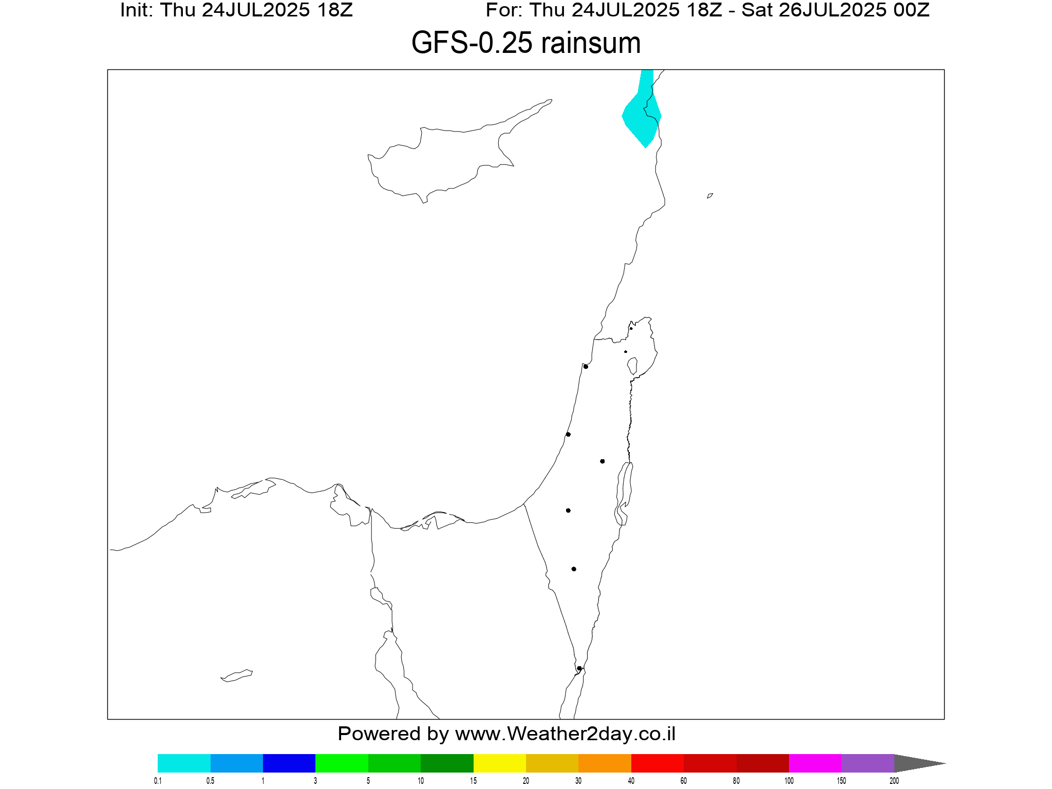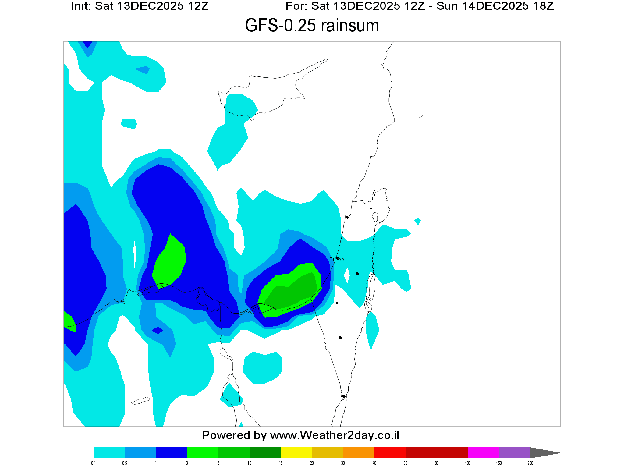 תחזית עבור כמות הגשם במ"מ ממודל GFS האמריקאי לתחזיות לטווח בינוני לעשרת הימים הקרובים